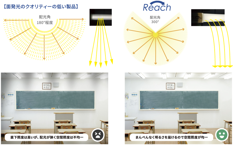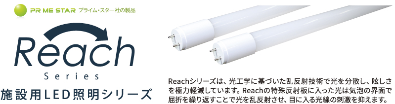 主力商品のReachシリーズは、光工学に基づいた乱反射技術で光を分散し、眩しさを極力軽減 | ご提案する快適な優しいあかリは、オフィス、店舗・商業施設、病院・介護施設、学校、工場などあらゆるシーンで活躍しています。 | あかりの質にこだわり、空間で作業をされる人々の快適性を大事にしています。 |